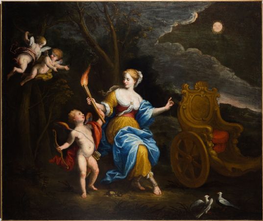 Peinture à l'huile sur toile représentant "Vénus et Amour" du peintre génois Giovanni Raffaele Badaracco (Gênes 1648-1717).