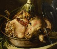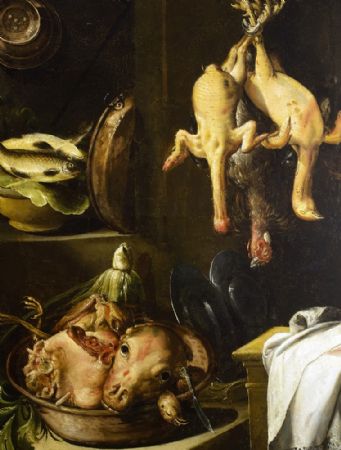 Wunderschönes Gemälde des Malers Bartolomeo Arbotoni oder Arbotori aus Piacenza (Piacenza 1594 – 1676); die Komposition ist ein typisches Werk des Malers, der sich von den reichhaltigen flämischen Vorratskammern inspirieren lässt: Wir finden Fische, einen Kalbskopf, ein Messer und daneben auf dem Tisch ein Geschirrtuch, einen Sellerie und gerupfte Hühner und Truthähne, die an mehreren horizontalen Ebenen liegen. Kupferutensilien (Backblech, Becken und Kessel) und Zinnteller werden gekonnt eingesetzt, um die Tiefe der Räume zu definieren.