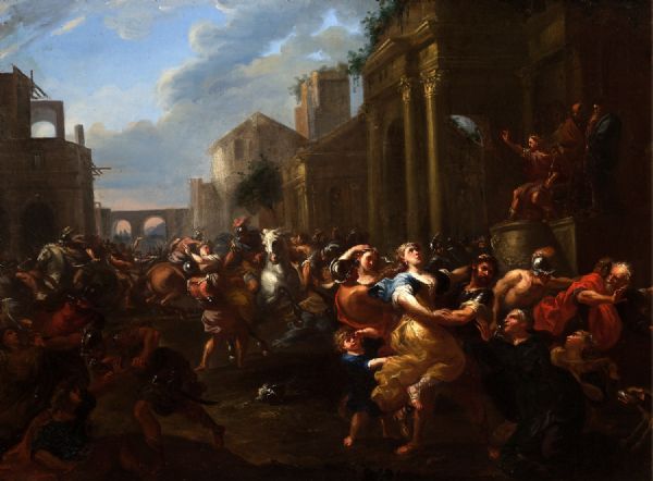 O tema retratado nesta esplêndida tela é o rapto das sabinas, um episódio narrado por Tito Lívio e Plutarco que conta sobre uma "festa" organizada por Rômulo (fundador e primeiro rei de Roma): os convidados são os sabinos, uma população presente entre os territórios compreendidos entre os rios Tibre, Nera, Aniene e Aterno. A intenção oculta é matar os homens sabinos para raptar suas esposas e filhas, entregá-las em casamento aos futuros cidadãos romanos para povoar a cidade nascente.
