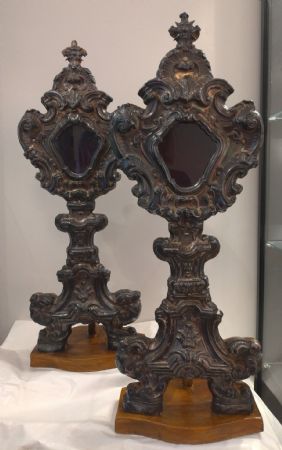 Superbe paire de reliquaires en plaque d'argent repoussé sur base en bois. Naples 1763 Dimensions : hauteur 73 cm
