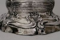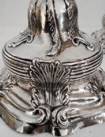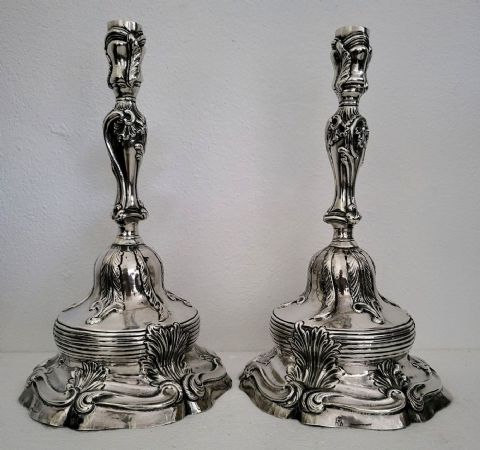 Wunderschönes Paar Kerzenständer aus getriebenem und ziseliertem Silber; in der Mitte eines breiten, dicken, runden Sockels, der mit einem profilierten Rand verziert und durch Akanthusblattmotive unterbrochen ist, erhebt sich der dreieckige Schaft, der ebenfalls mit Ledermotiven verziert ist.