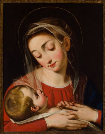 Unsere herrliche Leinwand zeigt die Madonna della Divina Provvidenza. Die Jungfrau ist als Halbfigur in Rot gekleidet und hält ihr Kind in den Armen. Eine Liebesbande wird durch einen Blickaustausch und durch die kleine Hand des Kindes verstärkt, die die Hand seiner Mutter ergreift. Ein transparenter Schleier bedeckt den Kopf und fällt auf die Schultern der Frau, als wolle er diesen Moment intensiver Intimität schützen. Das Motiv war erfolgreich und wurde daher von ihm selbst und von anderen repliziert, d. h. kopiert.