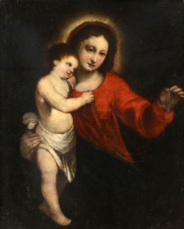Ölgemälde auf Leinwand, das die "Madonna des Rosenkranzes" des genuesischen Malers Orazio De Ferrari darstellt. Abmessungen: Leinwand 60 x 49,5 cm