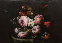 Esta espléndida pareja de pinturas inéditas, que representan abundantes ramos de flores, se atribuyen estilísticamente al pintor Antonio Mezzadri, activo en Bolonia en la segunda mitad del siglo XVII. Desde un fondo oscuro emergen, contrastando, una amplia gama de flores cortadas, una composición colorida y luminosa. Un pequeño caracol que asoma desde la oscuridad nos recuerda la conexión con la tierra y la importancia de proceder con lentitud y conciencia. Poco se sabe de la vida de este artista. "En 1688 vivía un Antonio Mezzadri, un excelente pintor de flores y frutas, y nuestra ciudad está llena de sus encomiables obras" [Felsina pittrice: vite de' pittori bolognesi. Tomo terzo. Alla maestà di Carlo Emanuele III re di Sardegna &c. &c. , Roma, 1769, pág. 30] Las numerosas obras mencionadas en los inventarios confirman el aprecio que los clientes tenían por el pintor floreciente; los estudios, el hallazgo de obras firmadas y selladas están permitiendo descubrir y catalogar a un verdadero maestro especializado en el género pictórico de la naturaleza muerta de flores. Su pequeño tamaño permite una fácil ubicación, y las condiciones de conservación son excelentes. Dimensiones: lienzo 37 x 52 cm - marco 54,5 x 69 cm