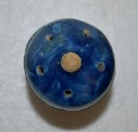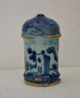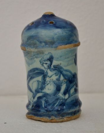 Rare pièce d'ameublement de table « sucrier ou poivrier » en faïence, décor baroque figuratif en monochrome bleu sur fond bleu clair. Il présente un corps de forme cylindrique, sur la partie supérieure en forme de dôme se trouvent cinq trous pour la sortie du contenu et au centre le logement du pommeau aujourd'hui manquant. Un vrai bijou ! Albisola, manufacture Conrado, XVIIe siècle. Dimensions : h 9,5 cm – diamètre de la base 5 cm