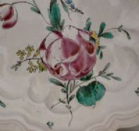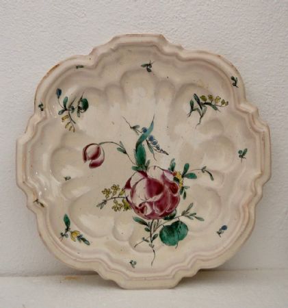 Our unusually shaped plate has a mixtilinear profile. It is decorated with large naturalistic flowers, a clear inspiration from the bouquets of the Hannong manufactory of Strasbourg. The colors are typical of his production, and the Jacques Boselli mark is present on the back.