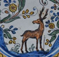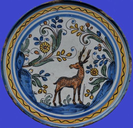 Petit présentoir en faïence polychrome à décor "calligraphique" représentant un cerf. En 1939, il a été exposé lors de l'exposition organisée au Palais Royal de Gênes, et porte l'étiquette et le numéro d'inventaire au dos.