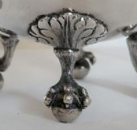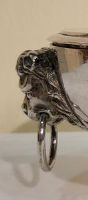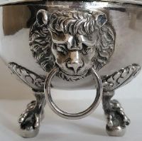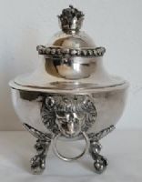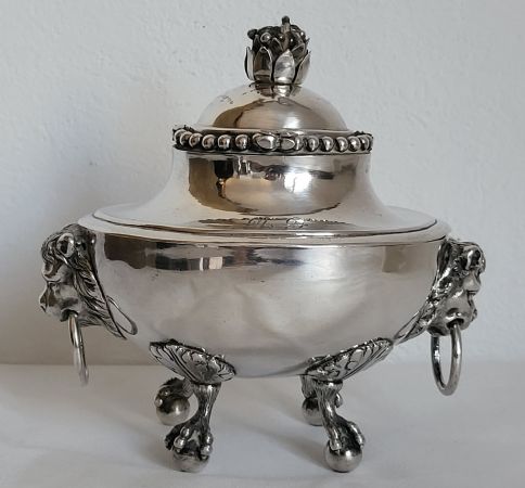 Intéressant sucrier Gênes Torretta (1)795 en argent repoussé, ciselé et fondu. Corps lisse ovale reposant sur quatre pieds en forme de patte de rapace reposant sur un globe ; aux extrémités, deux anses en forme de têtes de lion serrent un anneau entre leurs mâchoires.